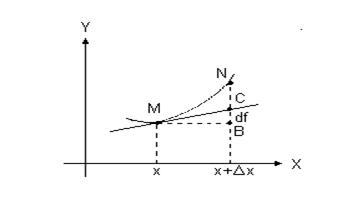 равен изменению ординаты, касательной к функции в точке N. Замена истинного приращения функции NB D f (x) = f (x + D x) - f (x) на дифференциал СВ