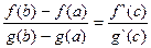 Теорема Коши. Пусть функции f (x) и g (x) непрерывны на отрезке [a,b], причем g (x) ≠ 0, дифференцируемы во всех внутренних точках отрезка, т. е. в интервале (a,b), то внутри отрезка существует точка с a < c < b в которой справедливо равенство