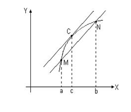 Формула Лагранжа (формула конечных приращений). Пусть функция у = f (x) непрерывна на отрезке [a,b], дифференцируема во всех внутренних точках отрезка, т. е. в интервале (a,b), то внутри отрезка существует по крайней мере одна точка с a < c < b в которой справедливо равенство: полное приращение функции равно производной, вычислленной в точке с, умноженной на длину промежутка