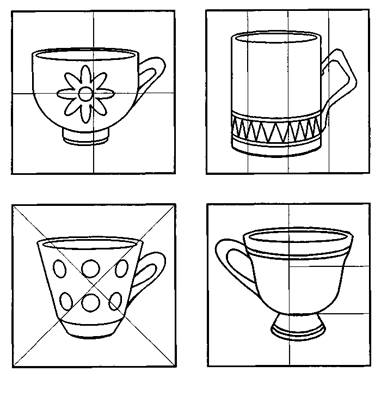 Логопед. Посмотрите, какие красивые чашки нарисованы на картинках. В конвертах такие же чашки, но «разбитые». Помогите мне «склеить» их. Сложите части картинки правильно.