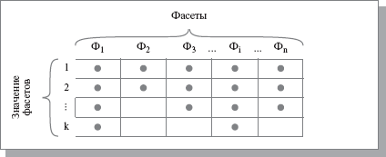 Под фасетным методом классификации понимается "параллельное разделение множества объектов на независимые классификационные группировки". При этом методе классификации заранее жесткой классификационной схемы и конечных группировок не создается. Разрабатывается лишь система таблиц признаков объектов классификации, называемых фасетами. При необходимости создания классификационной группировки для решения конкретной задачи осуществляется выборка необходимых признаков из фасетов и их объединение в определенной последовательности. Общий вид фасетной классификационной схемы представлен на рис.
