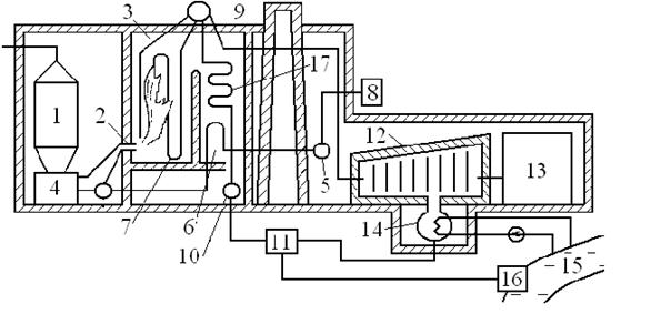 Водоподготовка. Вода, являясь теплоносителем на ТЗС, непрерывно циркулирует по замкнутому контуру. При этом особое значение имеет очистка воды, подаваемой в котел. Конденсат от паровой турбины (рис.1.5) поступает в систему II очистки от химических примесей (химводоочистка – ХВО) и свободных газов (деаэрация). В технологическом цикле вода-пар-конденсат неизбежны потери. Поэтому от внешнего источника 15 (пруд, река) через водозабор 16 производится подпитка водяного тракта. Вода, поступающая в котел, предварительно подогревается в экономайзере (теплообменнике) 17 уходящими продуктами сгорания.