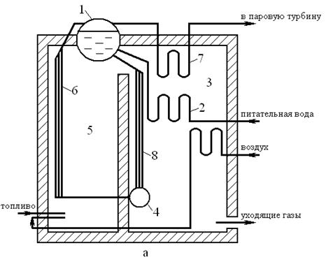 Котел барабанного типа имеет стальной барабан 1, в верхней части которого собирается пар. Питательная вода подогревается в экономайзере 2, находящемся в камере 3 уходящих газов, и поступает в барабан. В топочной камере 5 котла горение топлива при температуре 1500...20000С обеспечивает закипание воды. По стальным подъемным трубам 6, имеющим диаметр 30...90 мм и покрывающим поверхность топочной камеры, вода и пар поступают в барабан. Пар из барабана через трубчатый пароперегреватель 7 подается в турбину. Пароперегреватель может выполняться двух - трехступенчатым и предназначен для дополнительного нагрева и сушки пара. Система имеет опускные трубы 8, по которым вода из нижней части барабана опускается в коллектор 4.