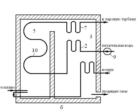 Котел прямоточного типа имеет принудительную циркуляцию воды и пара насосами. Питательная вода насосом 9 через экономайзер 2 подается в трубы-испарители 10,где превращается в пар. Через пароперегреватель 7 пар поступает в турбину. Отсутствие барабана и принудительна циркуляция воды и пара позволяют получить сверхкритические параметры пара: давление до 30 МПа и температуру до 590°С. Это соответствует энергоблокам мощностью до 1200 МВт и паропроизводителъности до 4000 т/ч.