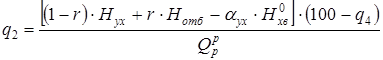 где hk – кпд парового котла, %; q2, q3, q4, q5, q6 – потеря теплоты соответственно с уходящими газами, химическим недожогом, механическим недожогом, на наружное охлаждение, со шлаком, %; В – полный расход топлива, кг/с; QПК – теплота, воспринятая рабочей средой в паровом котле, кДж/м;