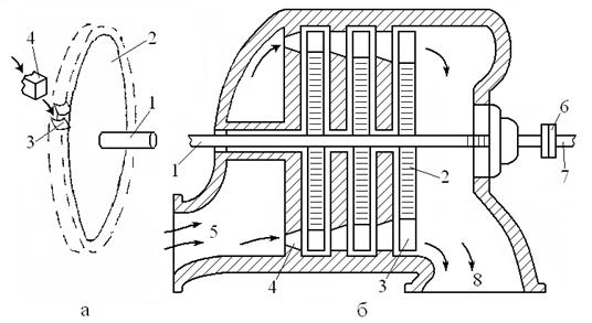 1 - вал турбины; 2 – диски; 3 - рабочие лопатки; 4 – сопла; 5 - паропровод; 6 – муфта; 7 – вал синхронного генератора; 8 – камера отработавшего пара.