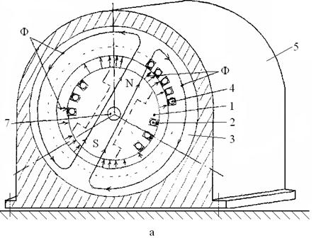 1 - ротор; 2 – обмотка ротора; 3 – статор; 4 - обмотка статора; 5 – корпус; 6 - источник постоянного тока – возбудитель.