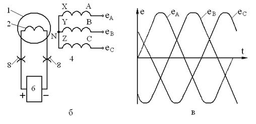 а- конструкция генератора; б- схема соединения обмоток; в- ЭДС на выводах обмоток генератора