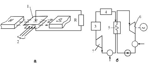 MГД- yстановки могут работать по различиям схемам. Один из вариантов - с ядерным реактором по замкнутому циклу (рис.1.17.б.). Рабочее тело (аргон или гелий с добавлением цезия) нагревается в ядерном реакторе или в высокотемпературном теплообменнике 3 и поступает в МГД- канал 4 где тепловая энергия движущейся плазмы превращается в электрическую. Отработавшие в МГД- канале газы, имеющие температуру около 1500 0С, поступают в парогенератор 5, который обеспечивает работу паротурбинной установки 6. МГД- цикл замыкается через компрессор 7, возвращающий газ в реактор или теплообменник 3.
