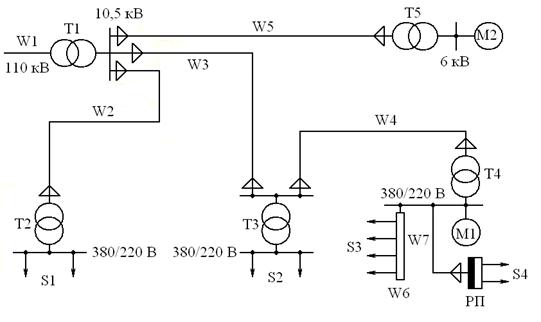 С учетом указанных требований к надежности электроснабжения выполняются схемы подключения потребителей к источникам электроэнергии. Пример такой схемы приведен на рис.3.1. По воздушной ЛЭП W1 электроэнергия подается от электростанции или из энергосистемы на главную понизительную подстанцию (ГПП) предприятия, где трансформатор Т1 понижает напряжение со 110 кВ до 10 кВ. По кабельным линиям 10 кВ W2…W5 к ГПП подключаются трансформаторы Т2, ТЗ, Т4 цеховых подстанций (ТП). На цеховых ТП напряжение понижается до 380/220 В, что обеспечивает возможность подключения непосредственно электроприемников общего назначения. Эти приемники подключается либо к шинам низкого напряжения цеховой TП, например, двигатель М1, либо к магистральному или распределительному шинопроводу W6 (нагрузка S3), либо проводом или кабелем к распределительному пункту РП (нагрузка S4). Высоковольтные двигатели М2, например, компрессорных установок, подключаются на соответствующее напряжение через трансформатор Т5.
