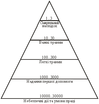 Причинами возникновения несчастных случаев может явиться нахождение человека в опасной зоне и одновременное нарушение правил безопасности, а также стечение целого ряда обстоятельств - сочетание случайного и необходимого. Существует определенная статистически подтвержденная закономерность опасных ситуаций, например, у шахтеров – число гибели людей на каждый миллион добываемой тонны угля и т.п. Исследования показывают, что одному смертельному случаю в России предшествуют 10-30 тяжелых травм, около 100-300 легких (с потерей трудоспособности на один день и более), порядка 1000-3000 микротравм и 10000-30000 опасностей, которые имеются на производстве. Условно это можно изобразить в виде пирамиды распределения травм и опасностей (аналогичную пирамиду впервые привела фирма «Дюпон»), как показано на рис. 1.