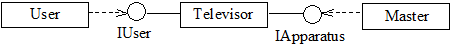 На рис. 4.3 показано, что пользователь взаимодействует с телевизором посредством интерфейса IUser, а телемастер – посредством интерфейса IApparatus.