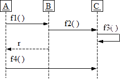 Пример. Диаграмма последовательностей приведена на рис. 5.19. На диаграмме отражено взаимодействие трех объектов. Сценарий начинается с вызова объектом А операции f1 над объектом В. Это порождает вызов объектом В операции f2 над объектом С, что потребует вызова объектом С операции f3 над собой. Когда эта операция будет выполнена, объект В передаст возвращаемое значение r объекту А, который затем вызывает операцию f4 над объектом С.