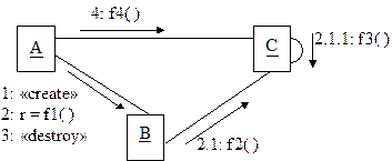 Порядковый номер показывает относительный порядок посылки сообщений. Сообщение с меньшим порядковым номером посылается до сообщения с большим номером. Нумерация начинается с единицы и добавляется как префикс к вызову операции. Для отображения вложенных сообщений используется следующая нотация: 1 – первое сообщение; 1.1 – первое сообщение, вложенное в сообщение 1; 1.2 – второе сообщение, вложенное в сообщение 1, и т.д.