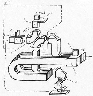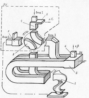 1 – вращающееся соединение поиска; 2 – растровый облучатель; 3 – ротор волноводного переключателя; 4,5,6,7 - волноводы