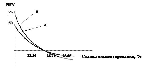 Рис.4.2. Зависимость NPV от ставки дисконтирования для двух взаимоисключающих проектов А и В.