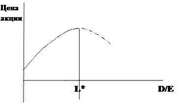 по сравнению с кредиторами. Как следствие, с одной стороны вследствие эффекта финансового левериджа возрастает ожидаемая EPS[22], с другой – вследствие увеличения риска растет ставка рыночной капитализации, что ведет к снижению рыночных котировок обыкновенных акций. В точке L* (рис. 6.3 б) второй эффект становится преобладающим, и акции начинают падать. Точка L* и представляет собой ту оптимальную структуру капитала, которая максимизирует стоимость фирмы. При этом обычно L*<< L**.