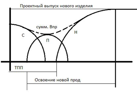 По вертикальной оси откладываем объем выпускаемой продукции Q: снимаемой с производства - С, новой продукции – Н.