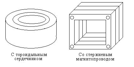 Магнитопроводы служат для того, чтобы обеспечить более полную связь между первичной и вторичной обмотками и увеличения магнитного потока. Выбор материала магнитопровода зависит от назначения и свойств трансформатора. Для трансформаторов питания широкое распространение получили холоднокатаные стали марок 3411-3424. В этих сталях при холодной прокатке кристаллы ориентируются вдоль направления проката, благодаря чему удается получить более высокую индукцию и меньшие потери. Для трансформаторов применяют три типа магнитопроводов: стержневой, броневой и кольцевой. По конструкции броневые сердечники подразделяют на сердечники, собранные из штампованных пластин, и ленточные.
