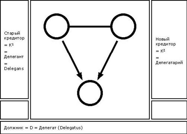 355. Делегация. Особо следует рассмотреть новацию обязательства путем замены его субъектов, а именно: если кредитор заменяется новым лицом, то мы имеем дело с активной делегацией, делегацией требования, delegatio nominis или просто делегацией; если же меняется личность должника, то говорят о пассивной делегации или экспромиссии. Остановимся на активной делегации, как более частом случае. Изобразим ее графически: