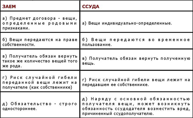 Ссуда и заем. Договор ссуды по хозяйственной цели является родственным договору займа; однако между ними имеются и существенные различия, как это видно из следующей таблицы: