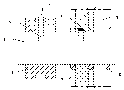 Шпонка 5 может качаться на оси 4 муфты 7, которая перемещает шпонку в осевом направлении. Пружина 6 удерживает шпонку в шпоночном пазу зубчатого колеса. Шайба 8 исключает одновременное включение 2-х зубчатых колес.