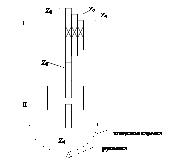При перемещении корпуса по валу II накидное колесо Z0 можно поочередно вводить в зацепление с колесами, установленными на валу I.