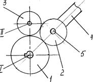 Передача движения с ведущего на ведомый вал осуществляется через зубчатое колесо 2, вращающееся на пальце 5 рычага 4, который может