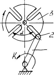 При непрерывном вращении кривошипа 1 палец 2 периодически входит в пазы мальтийского диска 3 и поворачивает его на угол α.