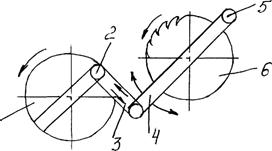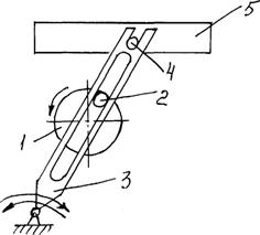 При непрерывном вращении кривошипного диска 1 палец 2 сообщает кулисе 3 возвратно-вращательное движение, а кулиса через палец 4 сообщает рабочему органу 5 возвратно-поступательное движение.