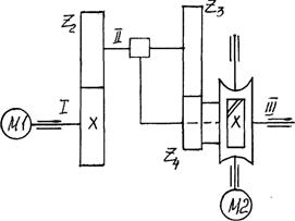 При включении М1, Z1 вращает Z2. Z2 обкатывается вокруг Z1 и одновременно с ним Z3 обкатывается вокруг неподвижного Z4, водило получает некоторое количество движений. Если дополнительно включить М2, через червячную передачу начинает вращаться Z4, которое вращает Z3 следовательно водило сообщается дополнительное движение.