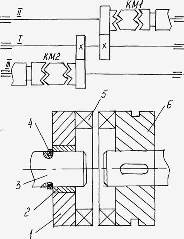 Зубчатые колеса насаженные на вал I находятся в постоянном зацеплении с зубчатыми колесами насаженными на ведомые валы II и III. Подключение валов II и III к ведущему, производится муфтами КМ1 и КМ2