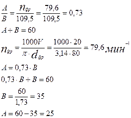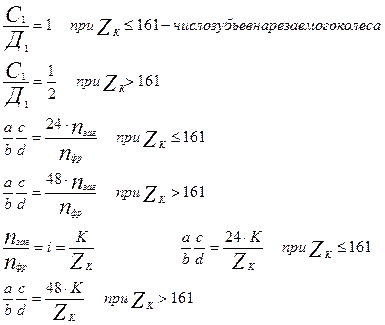 Пример. Настроить станок модели 5Д32 для нарезания цилиндрических колес (прямозубых) по следующим данным: Zк = 36, m = 3,5 мм, dфр = 75 мм, К = 2, V = 25 м/мин, Sв = 1,5 мм/об, β = 607/