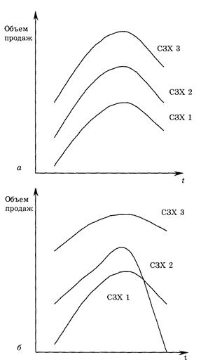 Рис. 4.1. Динамика объемов продаж фирм 1 и 2 в различных СЗХ: