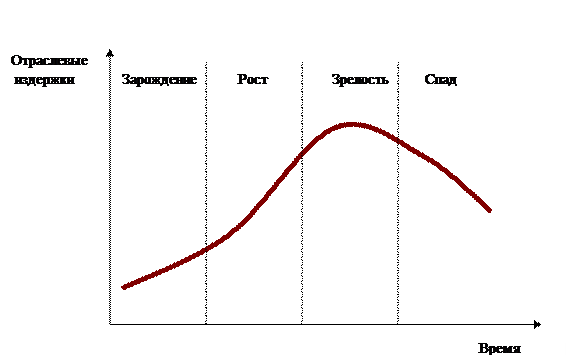 Отрасль, как и товар, имеет свой жизненный цикл (рис. 6.1), в котором выделяются стадии зарождения отрасли, ее роста, зрелости и спада. В первые годы изменения в отрасли (инновации) осуществляются динамично, жизненный цикл товаров короток. По мере развития отрасли скорость инноваций уменьшается, а рост поддерживается увеличением доли рынка.