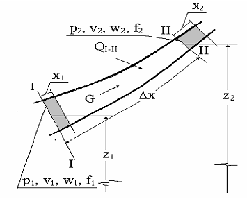 Рассмотрим направленное движение сжимаемой текущей среды вдоль канала произвольной формы между двумя сечениями I-I и II-II, расположенными вблизи друг от друга на расстоянии Δх. На рис. 2.9