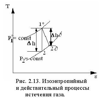 На рис. 2.13 в sh –координатах представлены процессы расширения газа 1* -2 при истечении без трения и 1* - 2