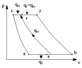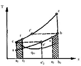 Цикл образует следующие процессы: а-с – адиабатное сжатие; c-r – изобарный подвод теплоты qто в теплообменнике, r-z – изобарный подвод теплоты q1 в камере сгорания, z-b – адиабатное расширение в турбине, b-e –изобарный отвод теплоты qто от продуктов сгорания в теплообменнике, e-a – изобарный отвод теплоты q2 в окружающую среду.