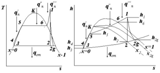 Основной цикл ПТУ, работающей по циклу Ренкина с перегревом пара изображен на Тs - и hs – диаграммах (см. рис. 4.5).