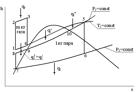 При анализе работы установки следует подчеркнуть, что расход горячих газов, поступающих в газовую турбину, и расход свежего пара, поступающего в паровую турбину, различны. Обозначим кратность расхода газов через m (расход газов в килограммах на один килограмм пара).