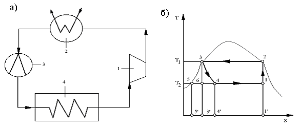 Отличительная особенность этой установки от воздушной состоит в том, что отвод и подвод теплоты производится по изотермам, а не по изобарам (рис.5.3).