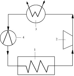 Образовавшийся пар сжимается в компрессоре 2 с повышением температуры от Т0 до Т1, зависящей от степени сжатия в компрессоре. Затем пар поступает в конденсатор (3), в котором отдает теплоту в отопительную или др. системы. Образовавшийся конденсат проходит дроссельный вентиль (4), где происходит понижение давления до р0 и далее конденсат снова поступает в испаритель (1). Цикл повторяется.