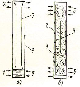 а – термосифон: 1 – подвод теплоты;2 – отвод теплоты; 3 – пар; 4 - конденсат; 5 – жидкость;б – тепловая труба: 1 – конденсат; 2 – фитиль; 3 – подвод теплоты; 4 – пар; 5 – отвод теплоты