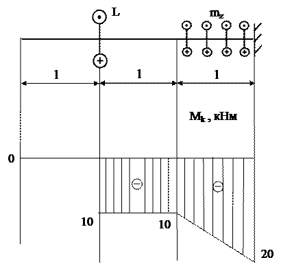 Mk (3l) = 0 – 10 – 10(3 – 2) = -20 кНм.