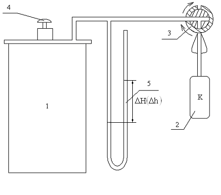 Далее через клапан сброса давления 4 воздух из баллона частично выпускается в атмосферу. Спустя 2…3 минуты, после выравнивания температур, измеряются уровни h1 и h2 в коленах дифманометра.