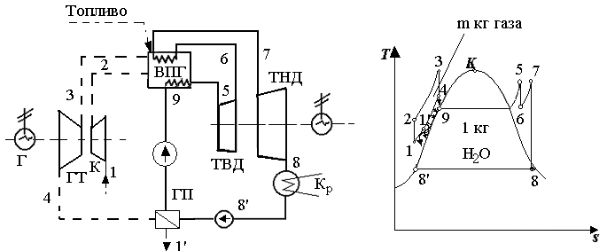 Пример 8. Парогазовая установка работает по следующей схеме (рис. 37): воздух из атмосферы (состояние 1) сжимается компрессором (состояние 2) и подается в топочное устройство высоконапорного парогенератора ВПГ, где сгорает топливо. Продукты сгорания сначала отдают часть своей теплоты нагретой до температуры кипения воде и водяному пару, циркулирующем в особом контуре, а затем направляются в газовую турбину ГТ (состояние 3), в которой изоэнтропно расширяясь, совершают полезную работу. Отработавшие газы (состояние 4) идут в газовый подогреватель ГП и нагревают в нем конденсат водяного пара до температуры кипения (состояние 9), после чего выбрасываются в атмосферу (состояние 1). Кипящая вода из подогревателя ГП направляется в парогенератор ВПГ, где испаряется и перегревается (состояние 5). Перегретый пар, отработав в турбине высокого давления ТВД (состояние 6), снова перегревается за счет теплоты топочных газов ВПГ (состояние 7),