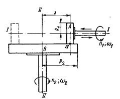 Диск А, вращаясь вокруг своей оси, приводит во вращение диск В. При перемещении диска А вдоль оси вращения I - I изменяется расстояние х от оси II – II, а вследствие этого и передаточное число.