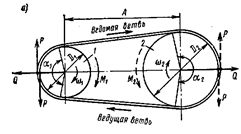 Ветвь ремня, набегающая на ведущий шкив называется ведущей, а ветвь, набегающая на ведомый шкив – ведомой (рисунок 6.5).