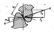 Силы взаимодействия между зубьями принято определять в полюсе Pо зацепления (рисунок 7.7). Распределенную по контактным линиям нагрузку в зацеплении заменяют равнодействующей Fn, которая направлена по линии давления (зацепления) NN. Для расчета зубьев валов и опор силу раскладывают на составляющие силы – окружную Ft. и радиальную Fr.