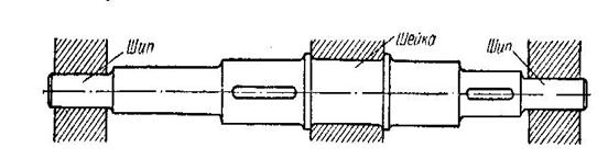 Конструктивные элементы валов и осей. Поддерживая детали передач, оси и валы, в свою очередь, сами опираются на неподвижные опорные части подшипников и подпятники. Участки осей и валов, лежащие в опорах, носят названия цапф. Концевые цапфы именуются шипами, а промежуточные – шейками (рисунок 9.1).